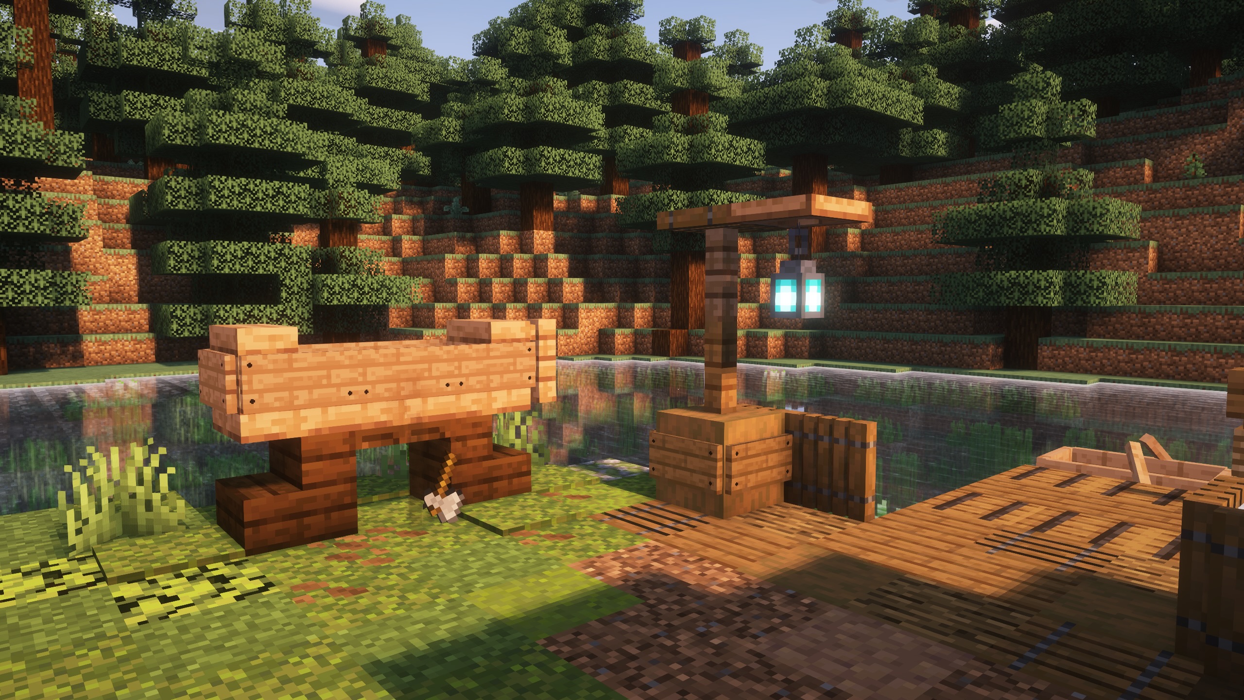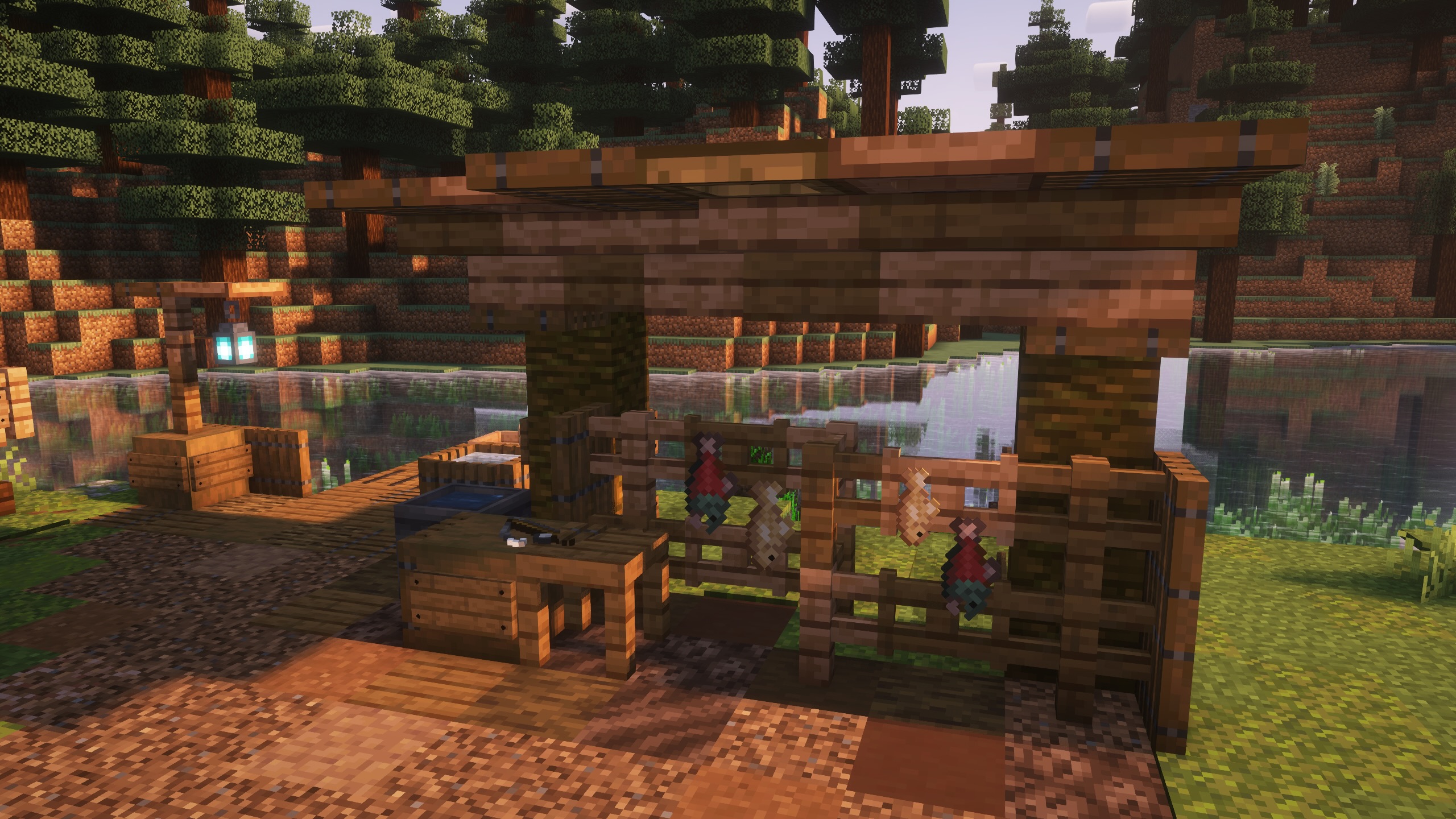 - Lots of fun details around the farmstead like the fish rack. (Armor Poser Mod), the dock, and carved canoe with leaf litter as wood shavings.