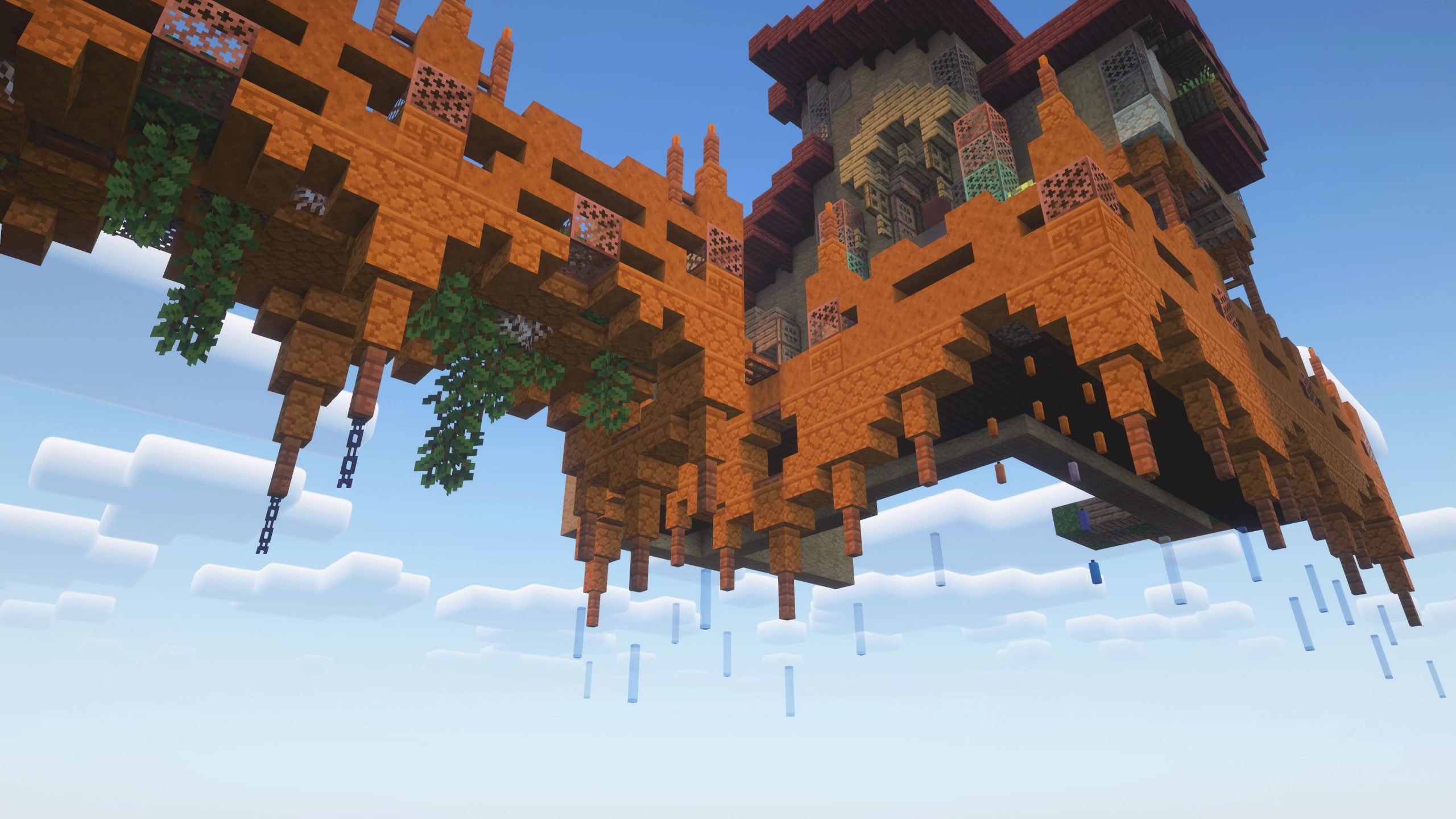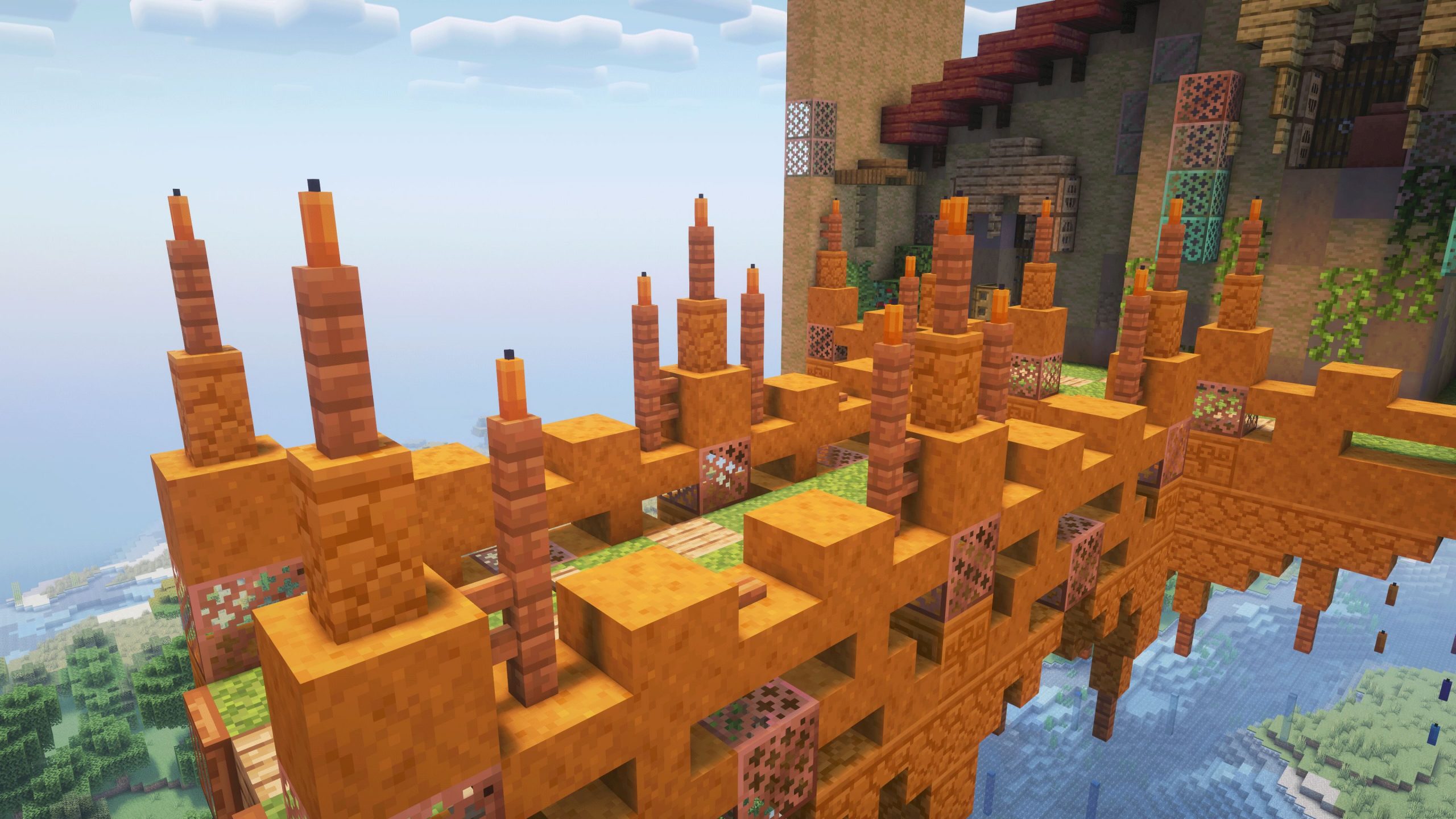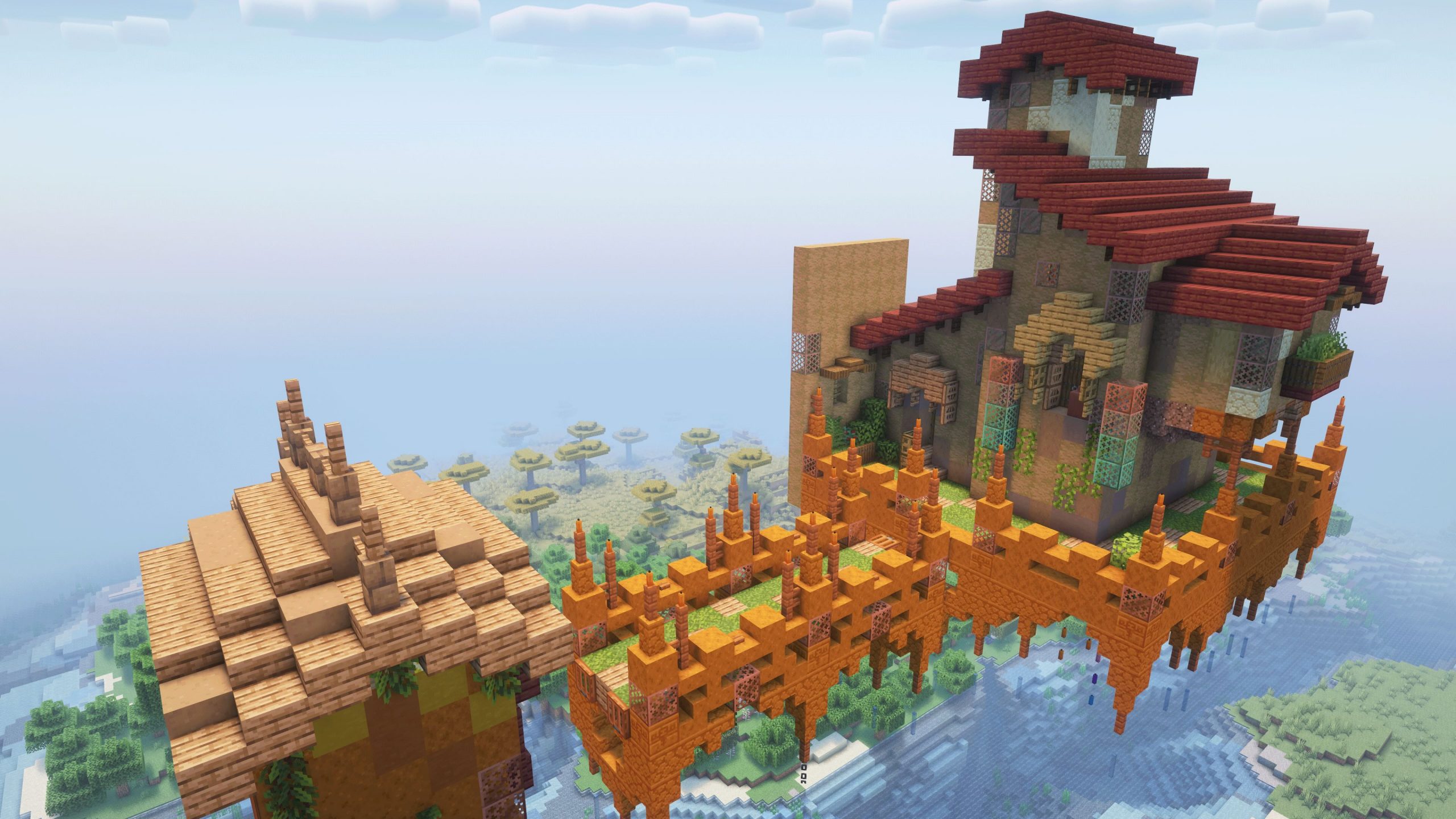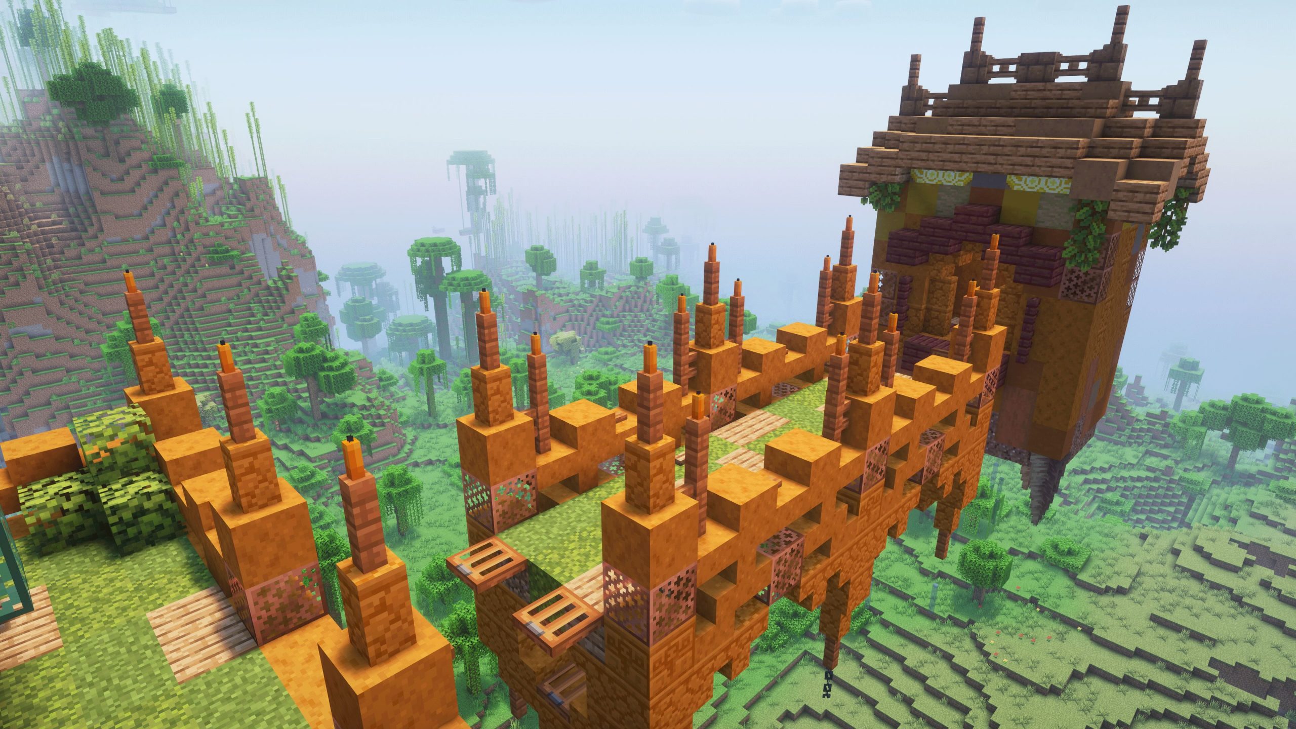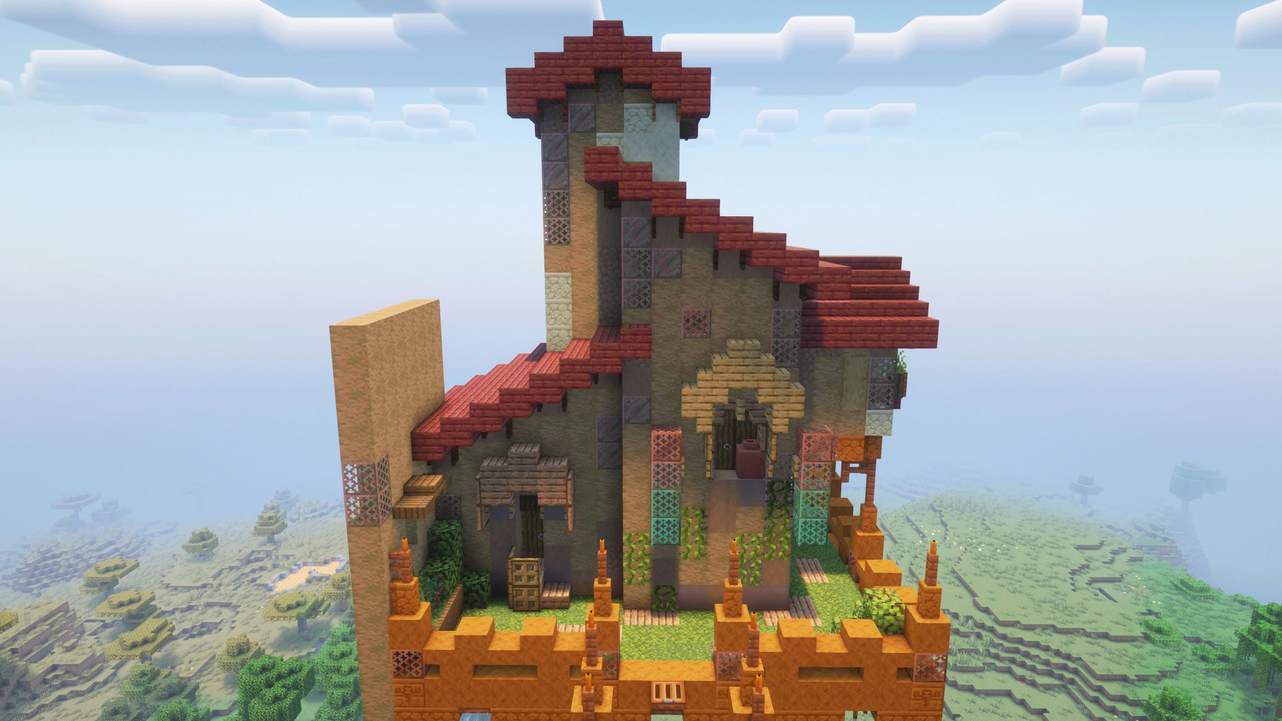 - Went with spruce, and jungle woods, as an initial block palette, then went back, and changed the roof to copper to add a cooler contrast to the build.