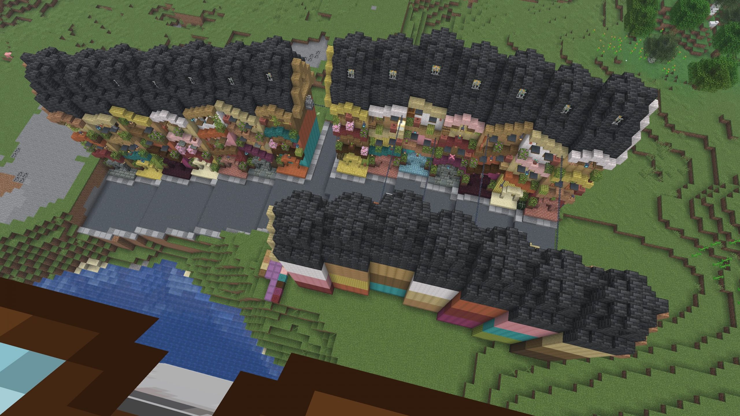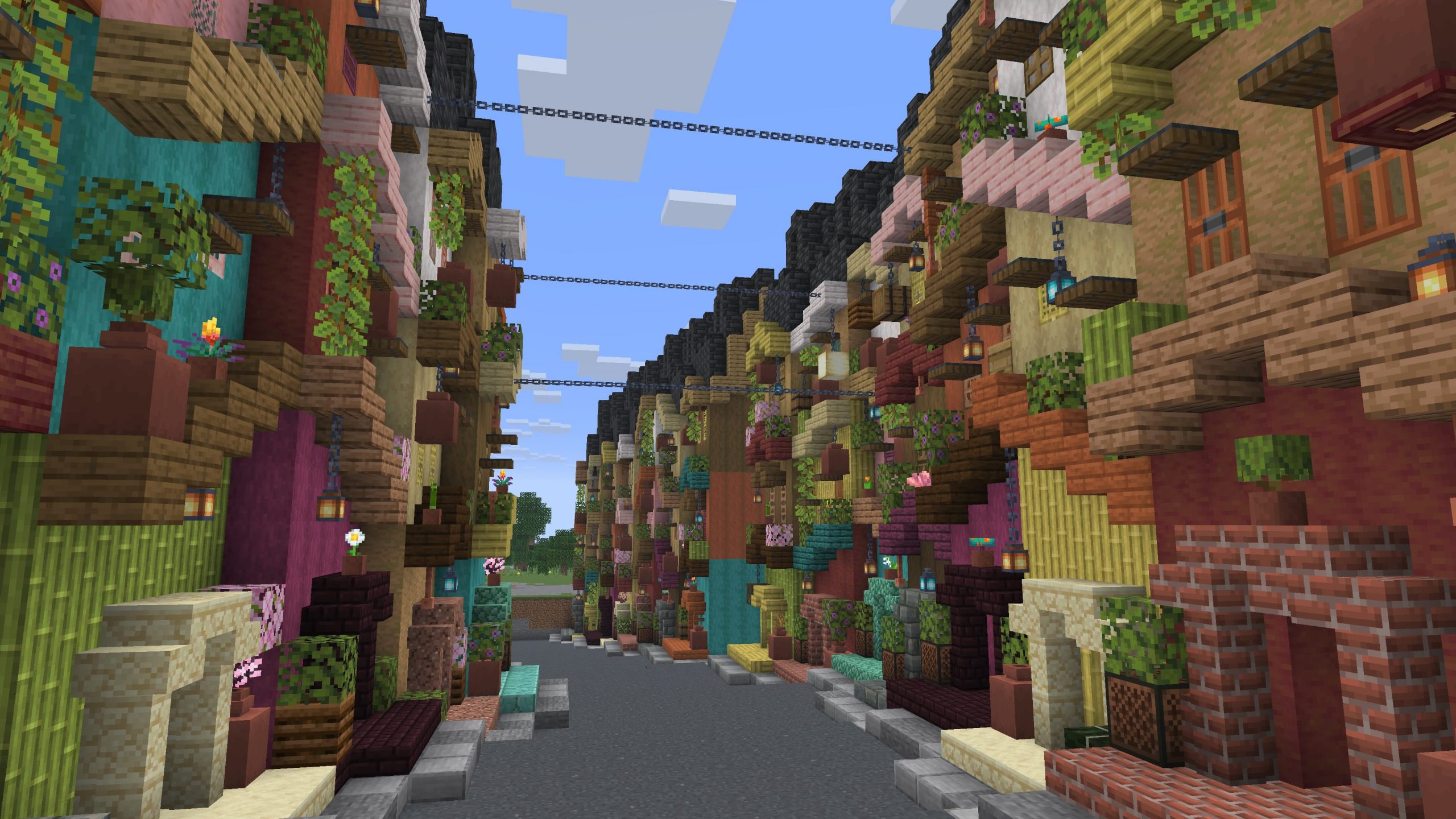 - Completed a row of fourteen terraced houses, widened the road, and built another seven on the other side giving the opportunity to string chains from one side of the street to the other as power lines, or perhaps washing lines.