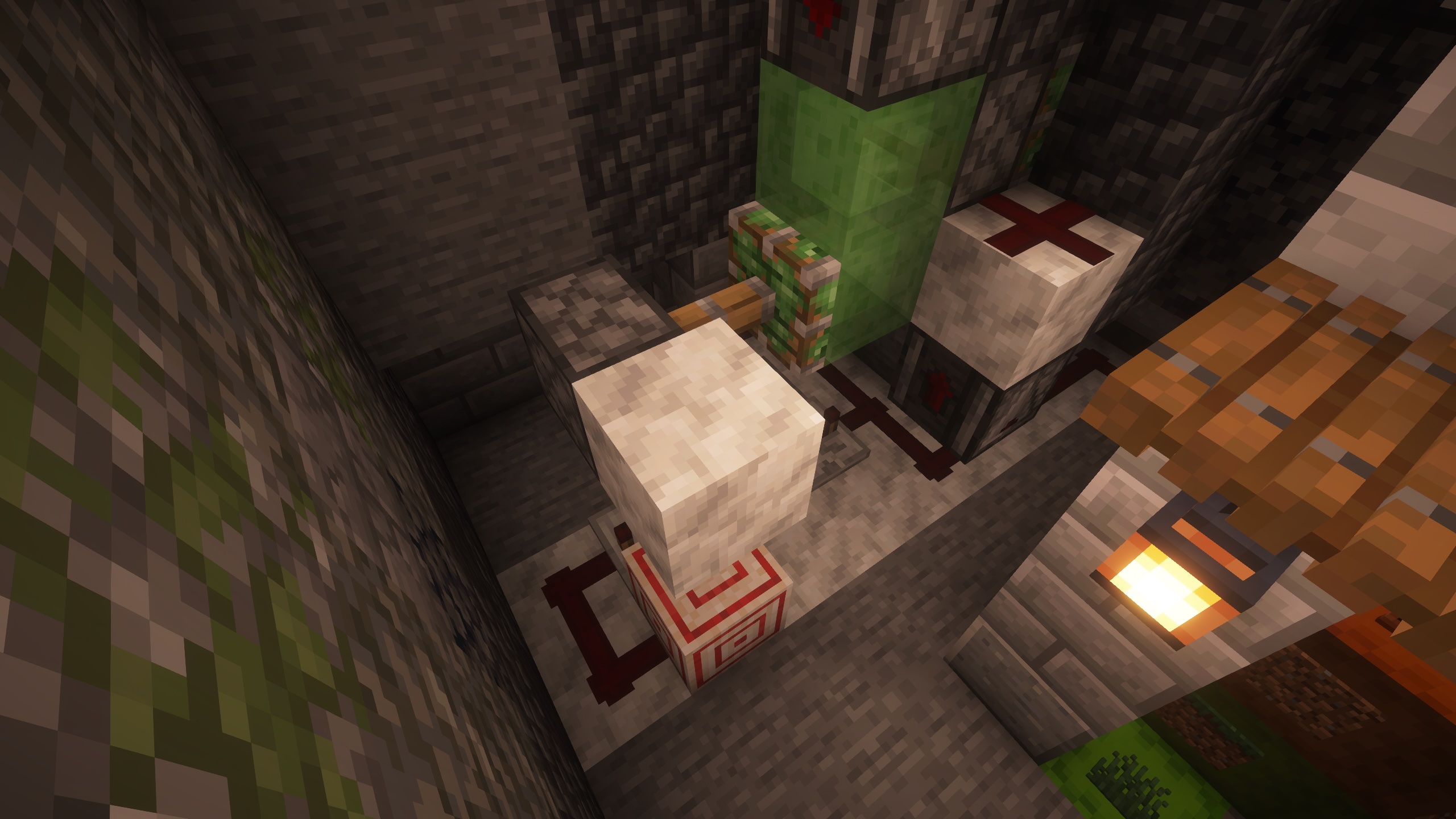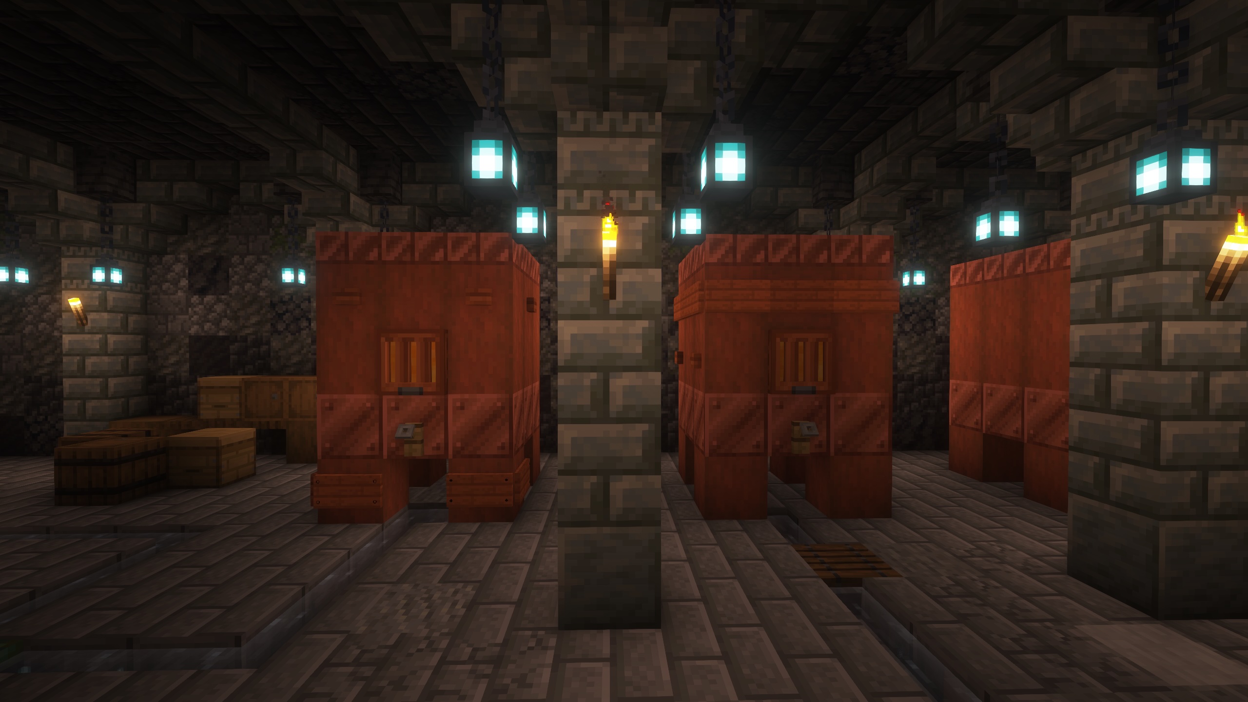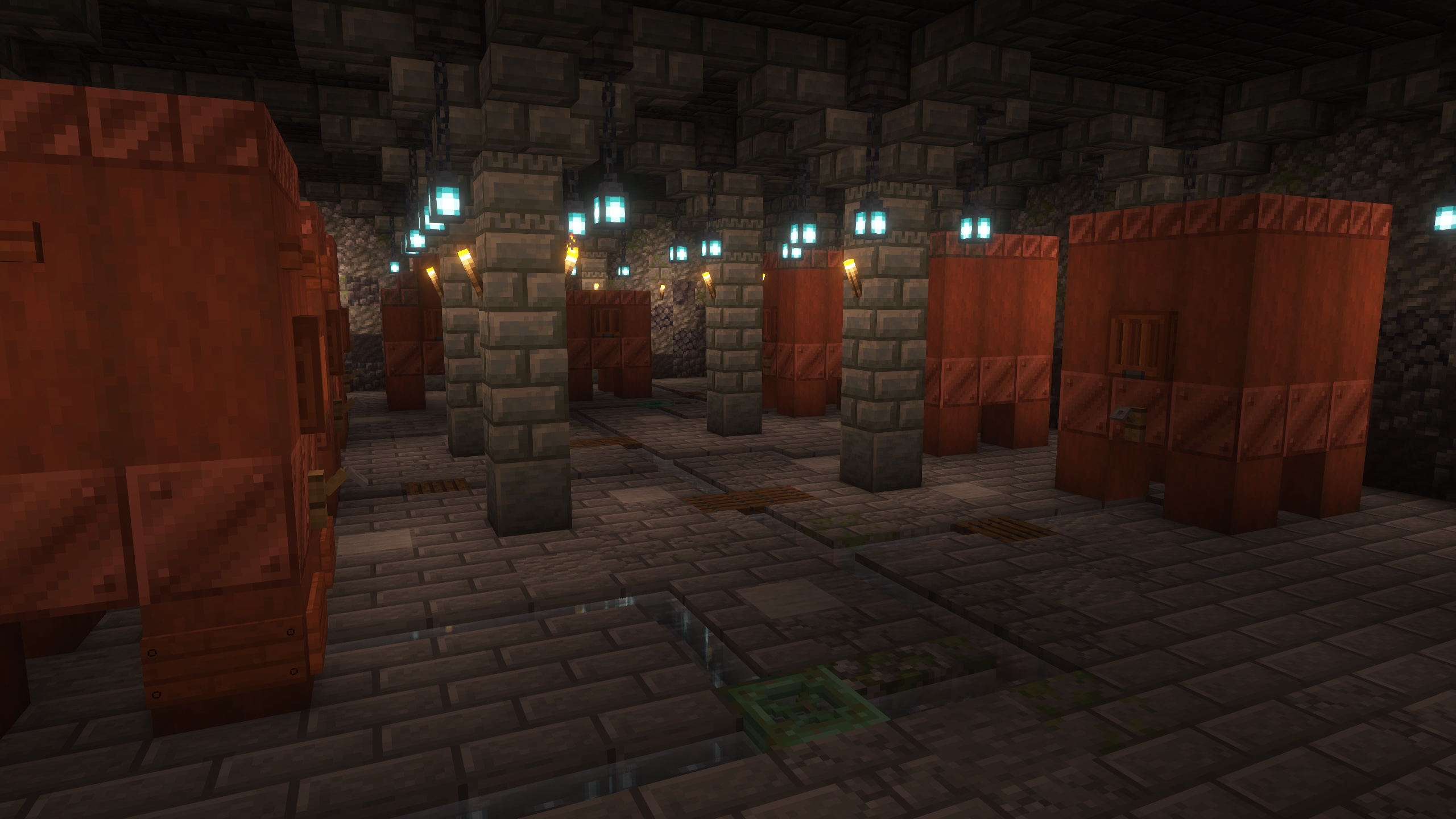 - Tuff bricks, and deepslate make up the supporting structure, and the ceiling.
