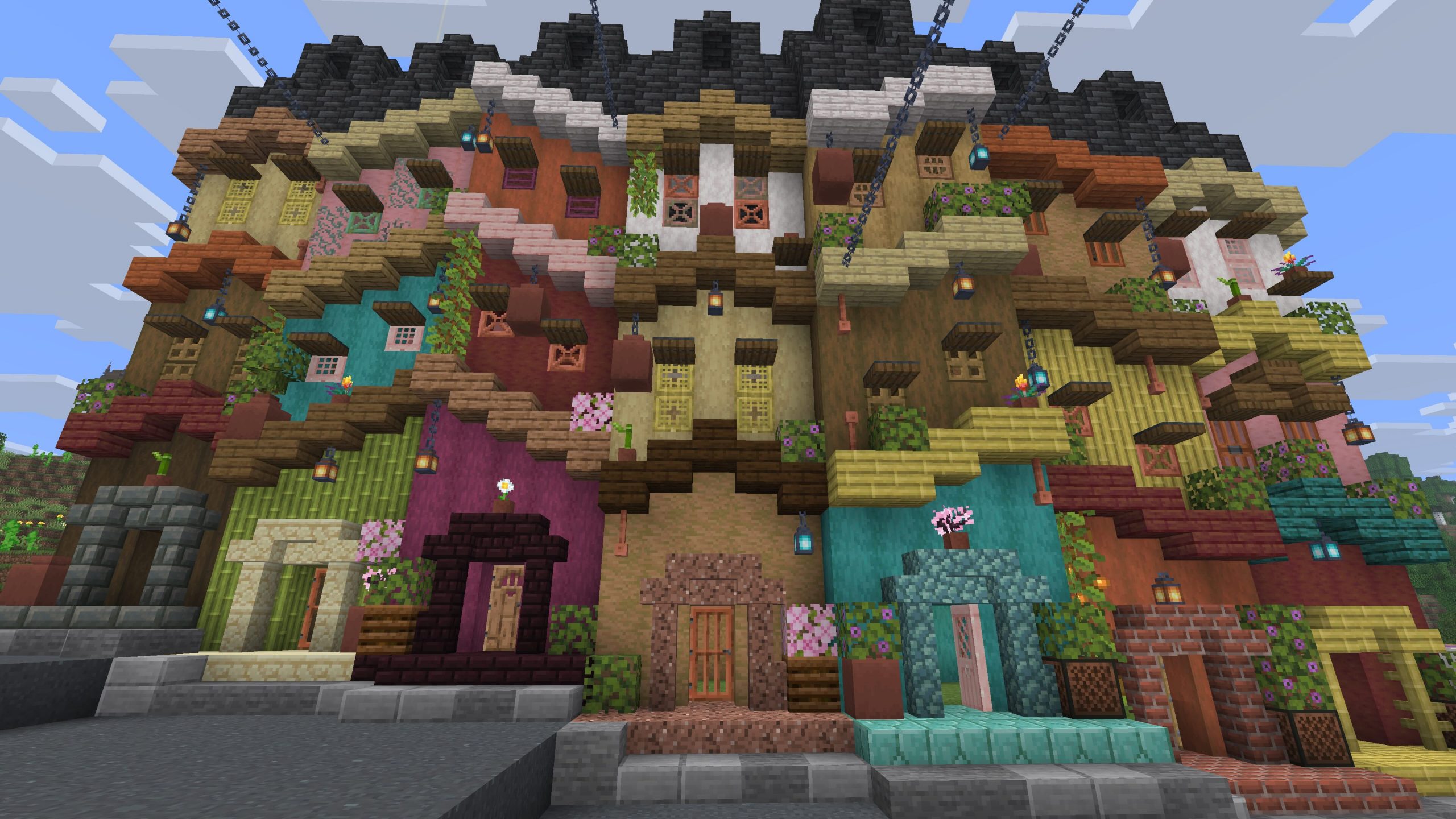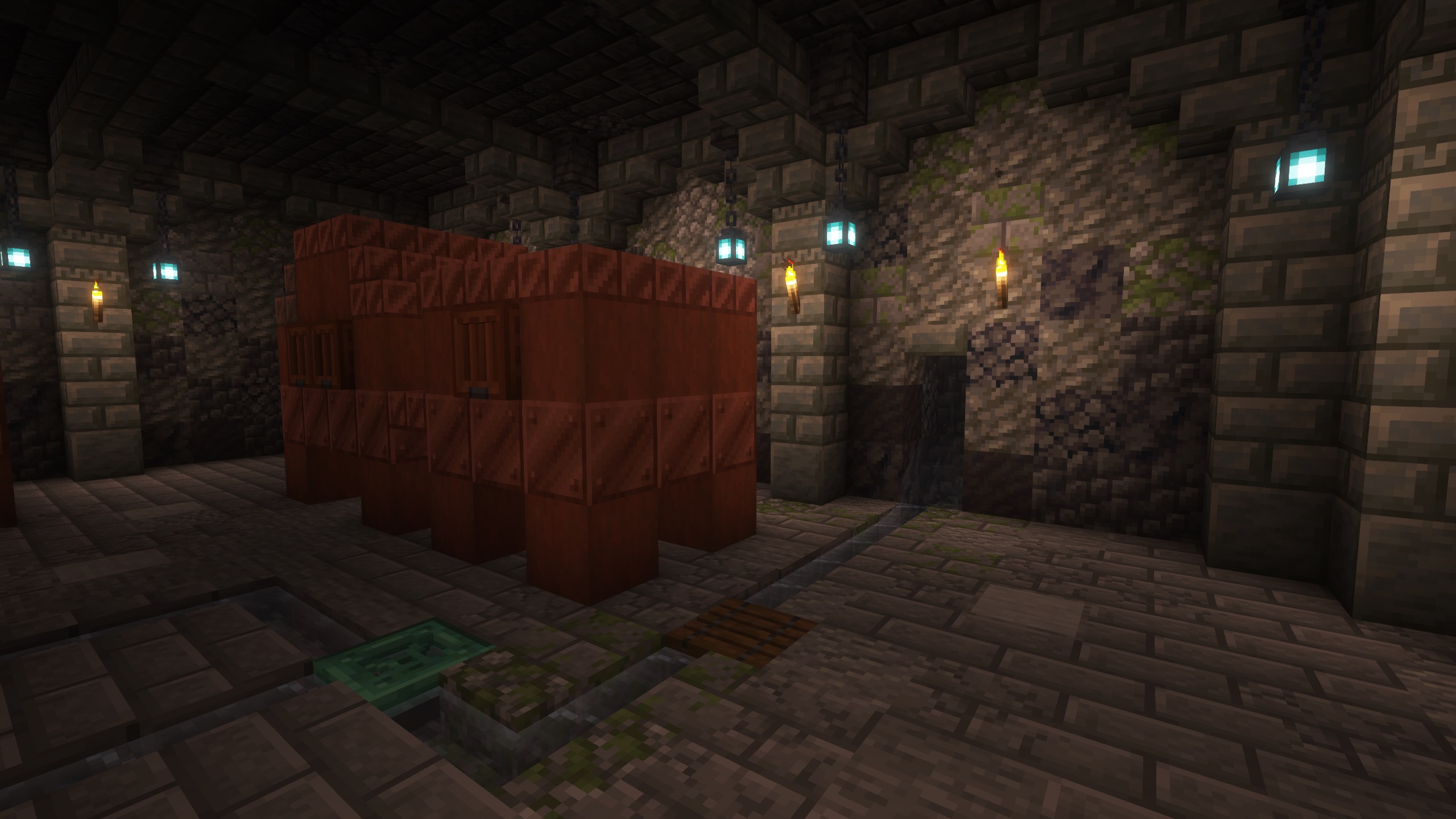 - Mud, deepslate, basalt, and mossy cobble make up the walls, and regular stone bricks, and related blocks were the best for the floor allowing for more stair options for the stair drain detail.