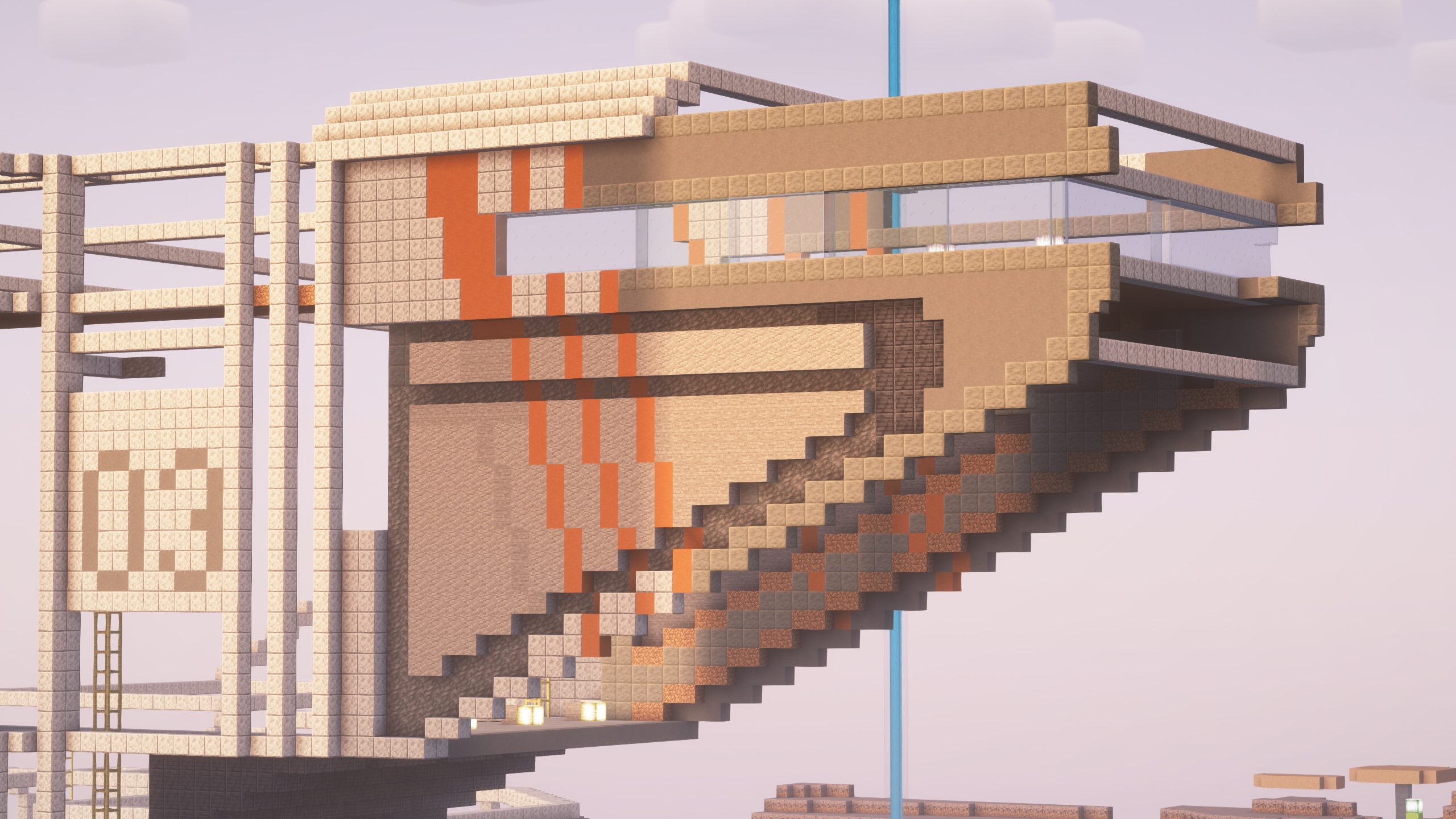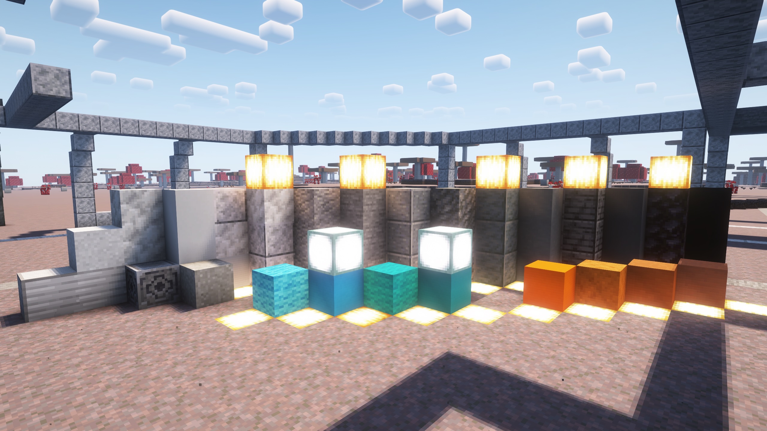 - Working with polished variants of tuff, deepslate, and diorite, along with cyan terracotta, and grey concrete with orange terracotta, and smooth red sandstone for accent colours.
