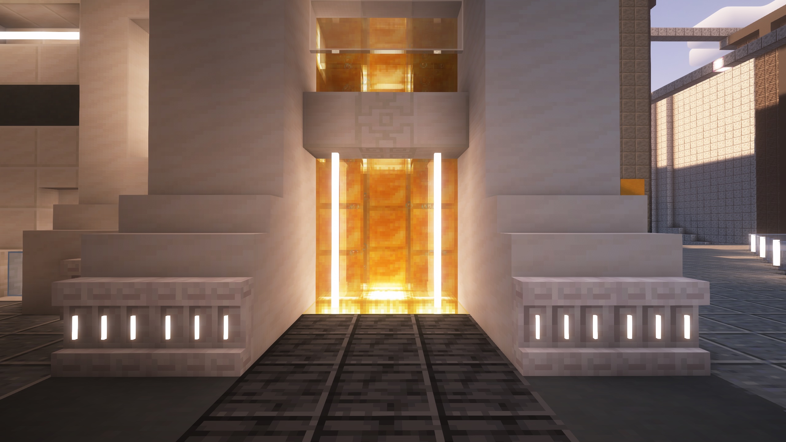 - Honey block elevators to the third floor are tucked inside the casing for the entrance.