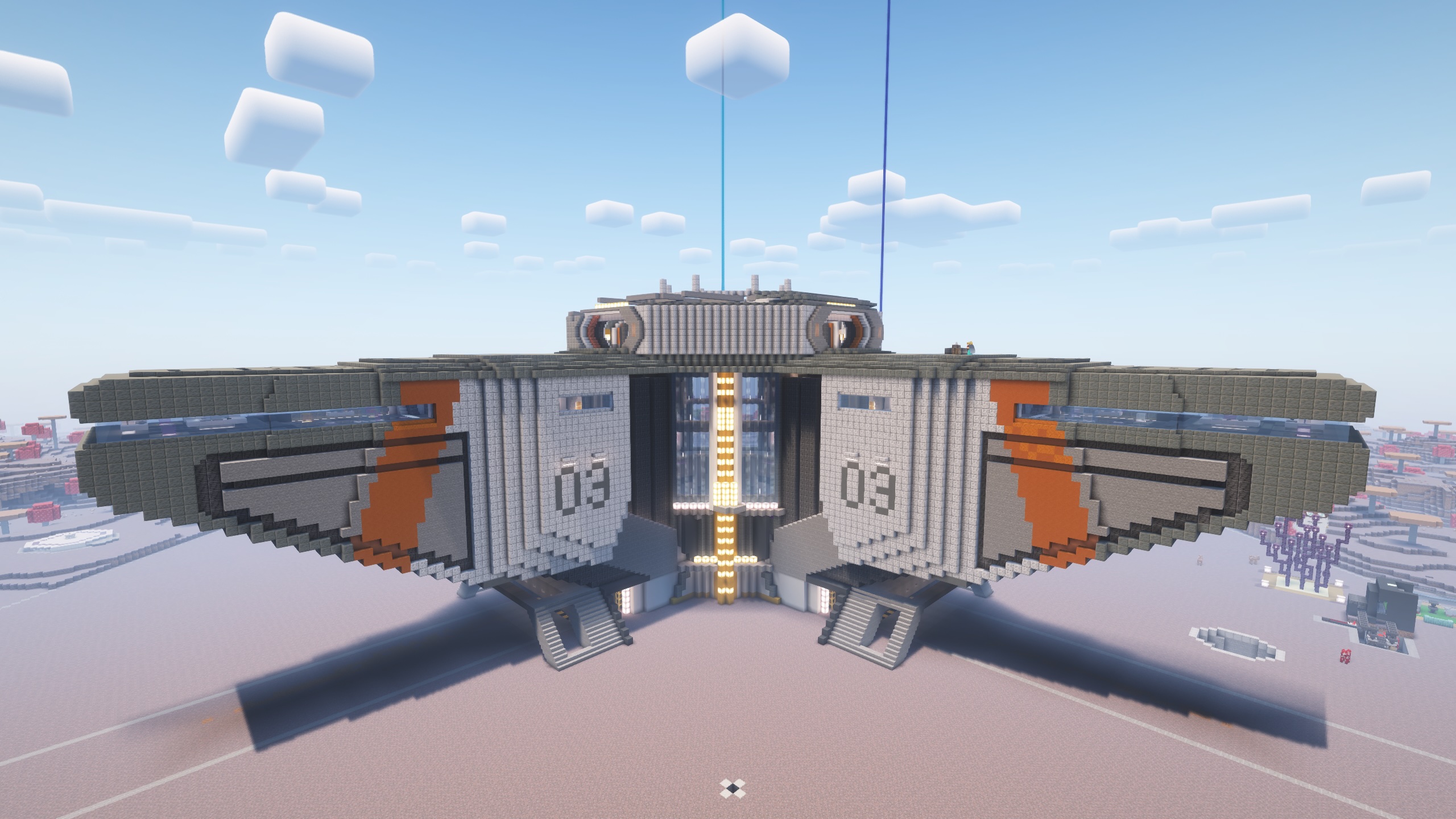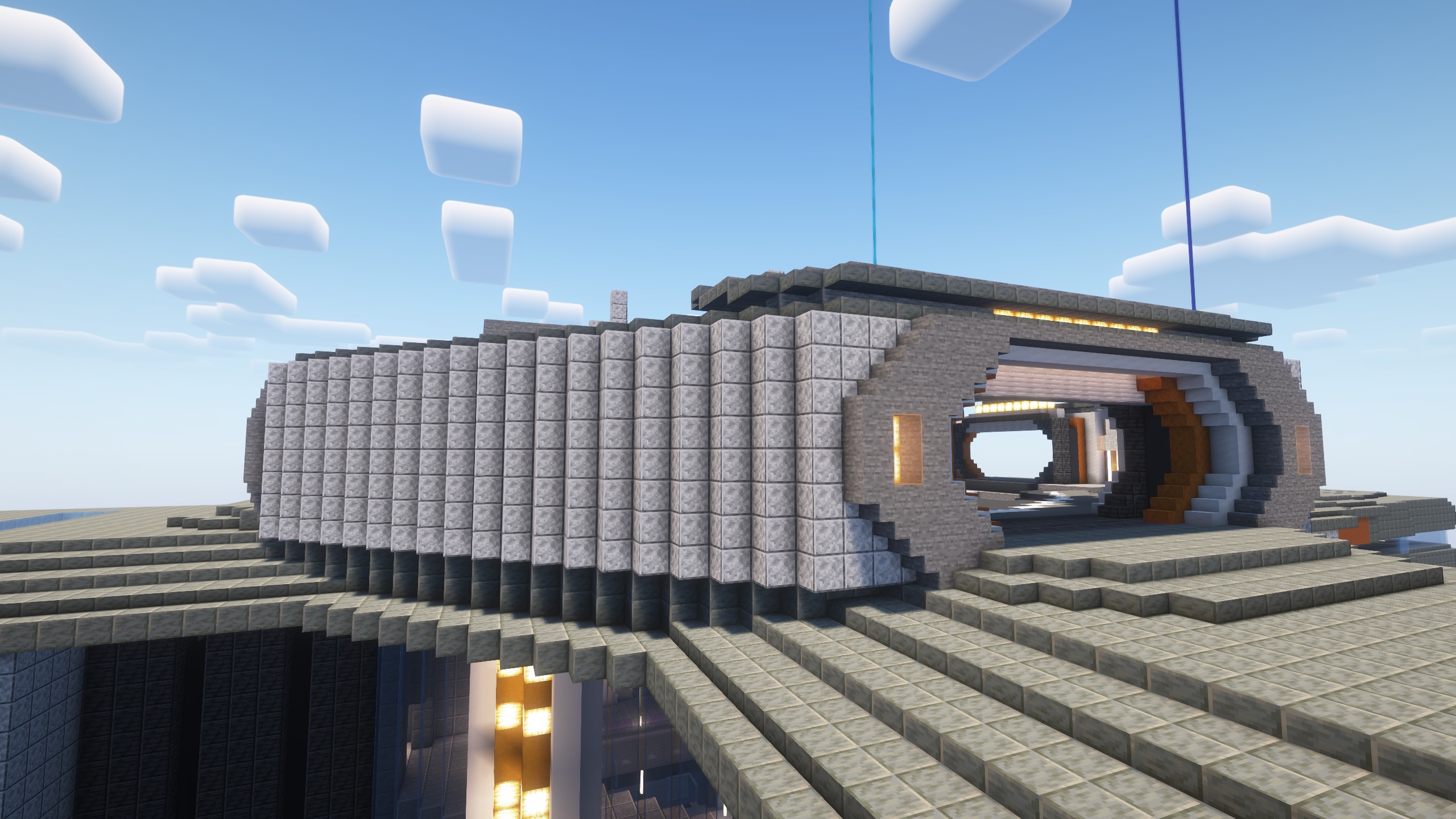 - The doors mimic some of the doors from Level 3, but designed with the exterior pallet of stone, deepslate, with some orange highlights. The orange in the bay doors will be either red sandstone, or waxed copper blocks.